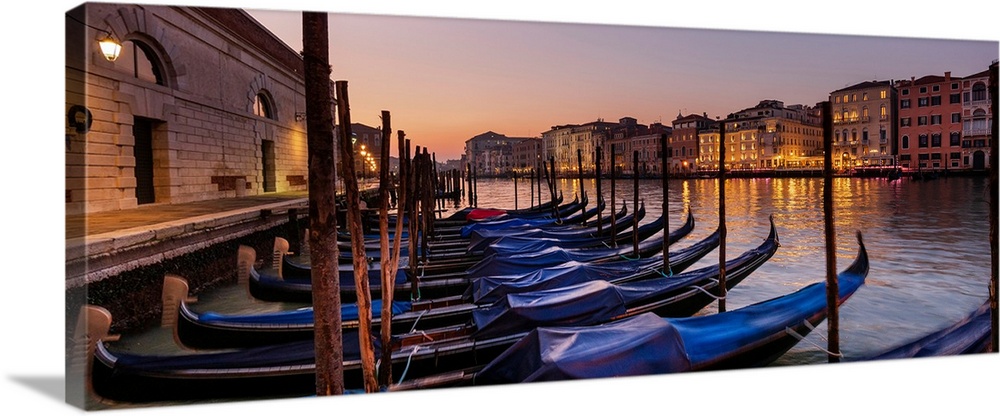 <p>Gondolas covered in blue tied along the shoreline in a canal in Venice, Veneto, Italy.</p>