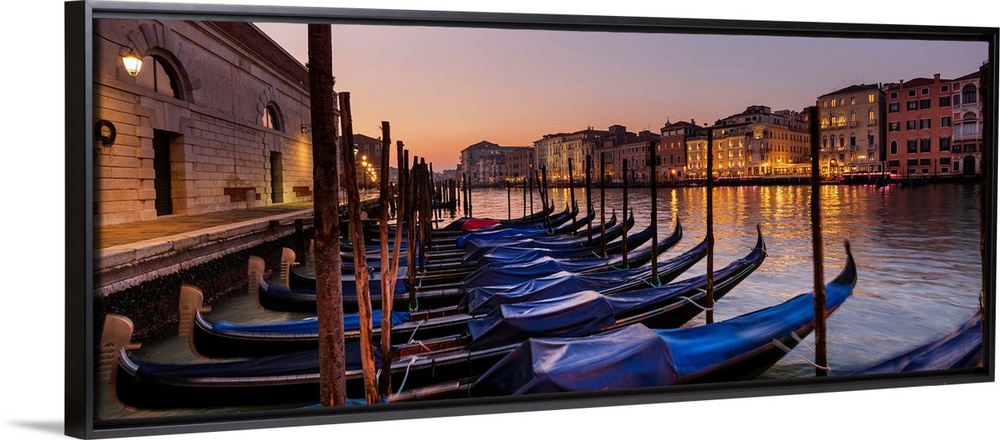 <p>Gondolas covered in blue tied along the shoreline in a canal in Venice, Veneto, Italy.</p>