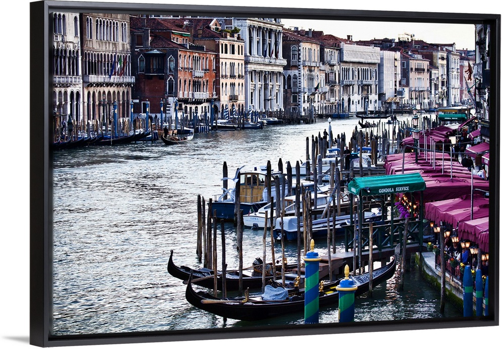 <p>Gondola boats sit in the water which curves toward the back of the picture and is lined on either side by buildings and docks.</p>