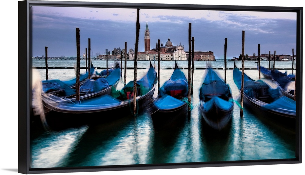 <p>Big photograph of empty gondolas tied to poles in Venice, Italy with buildings in the background.</p>