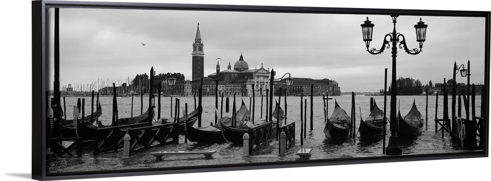 <p>Wide angle photograph of a line of gondolas parked near the shore, the Church Of San Giorgio Maggiore on the distant horizon, in Venice, Italy.</p>