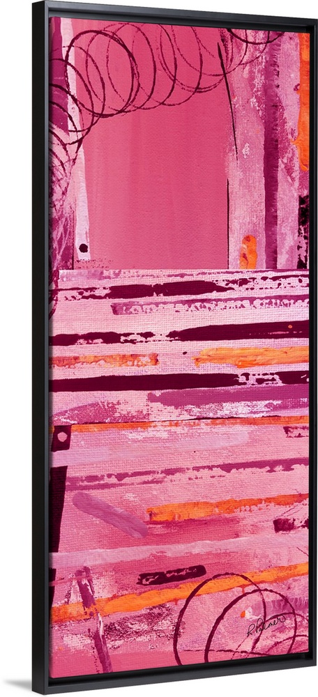 <p>Tall abstract painting in shades of pink, red, and orange with maroon swirling designs on top.</p>