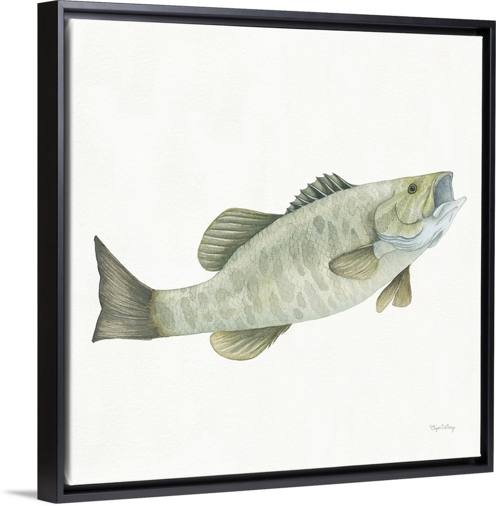 <p>Square watercolor painting of a small mouth bass on a solid white background.</p>