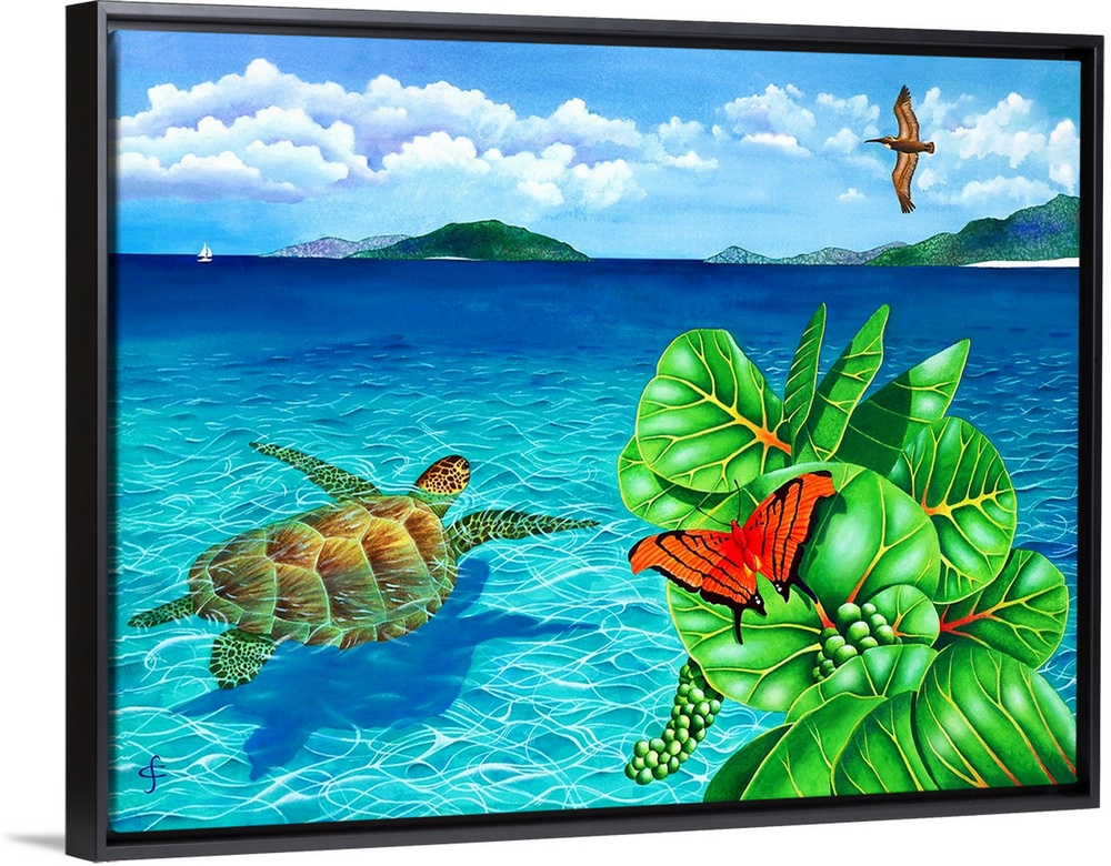 <p>Tropical themed artwork of a sea turtle swimming in crystal blue water, with a bright butterfly on a green plant in the foreground.</p>
