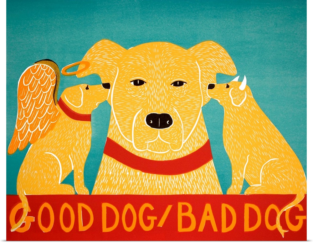 <p>Illustration of a yellow lab with an angel and devil yellow lab on each shoulder whispering in its ear and the phrase "Good Dog/Bad Dog" written at the bottom.</p>