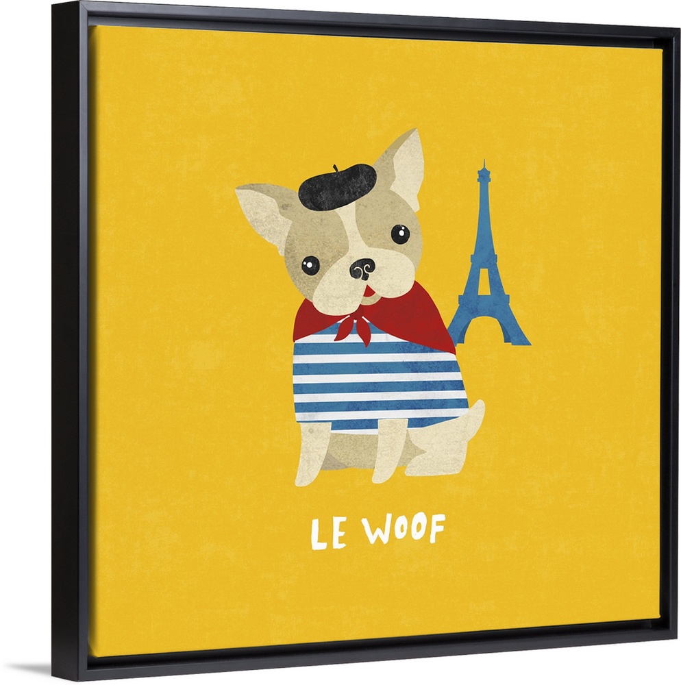 <p>Cute illustration of a French bulldog wearing a beret near a small Eiffel Tower.</p>