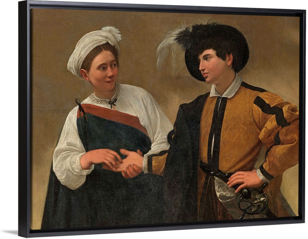 <p>The Good Luck, by Michelangelo Merisi known as Caravaggio, 1593 - 1594 about, 16th Century, oil on canvas, cm 115 x 150 - Italy, Lazio, Rome, Capitoline Museums, Palazzo dei Conservatori. Total. couple woman gypsy magician clarovoyant young man boy hat pl</p>
