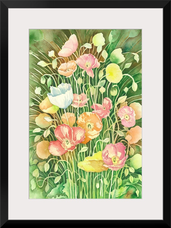 <p>Colorfully created the bunch of poppy flowers on the fresh green background in watercolor on paper.</p>