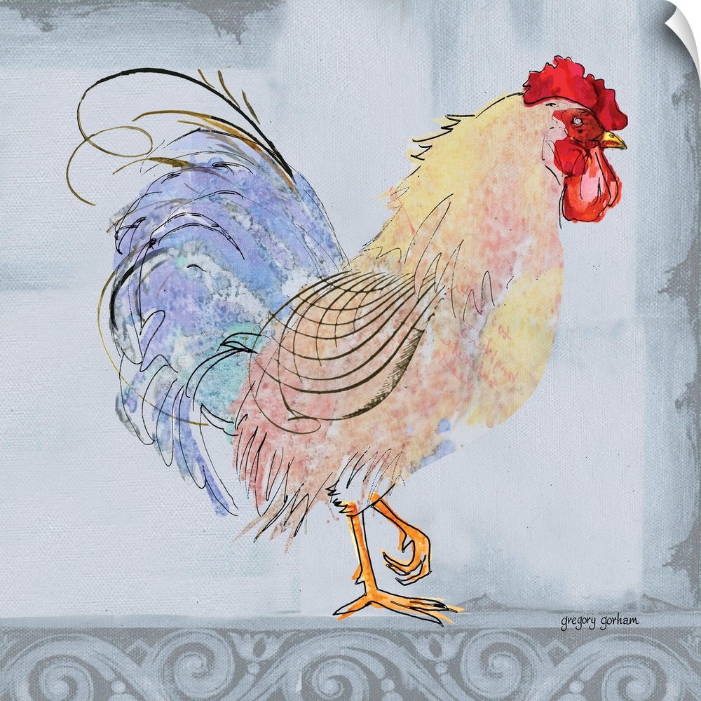 <p>Square art with a colorful illustration of a rooster on a pale blue and grey background.</p>