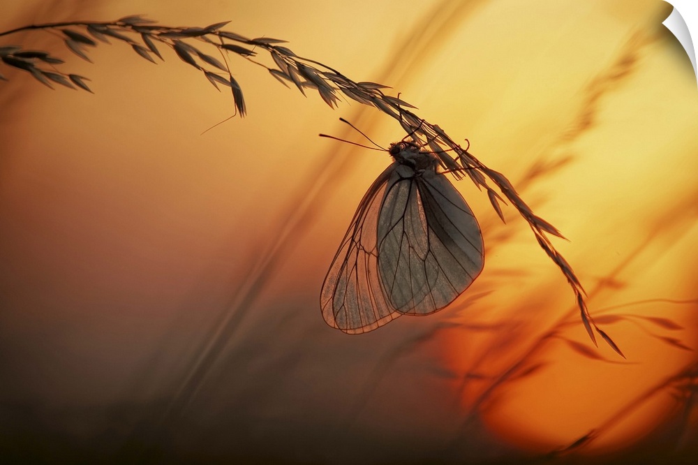<p>A butterfly with translucent wings handing from a stalk of wheat at sunset.</p>