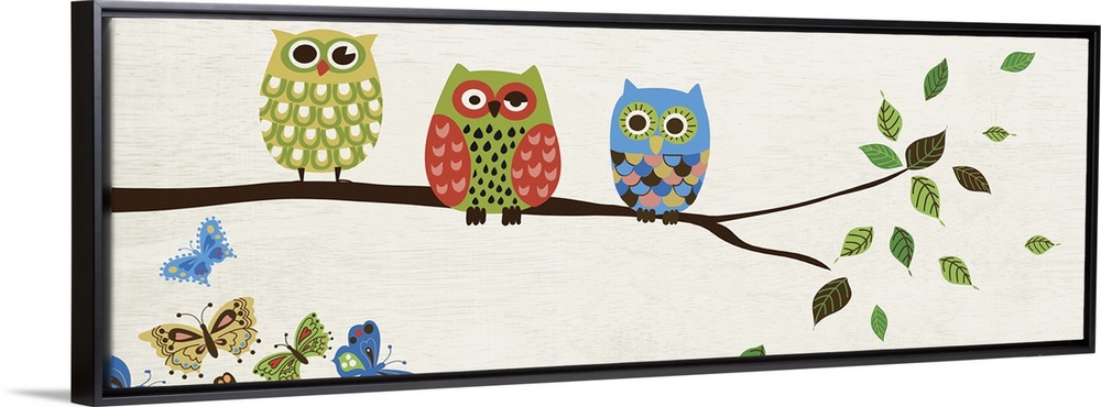<p>Contemporary artwork of owls in multiple colors perched on a branch.</p>