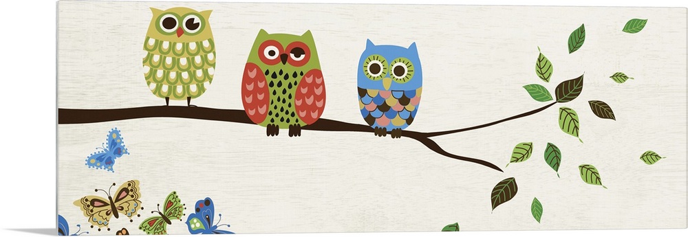 <p>Contemporary artwork of owls in multiple colors perched on a branch.</p>