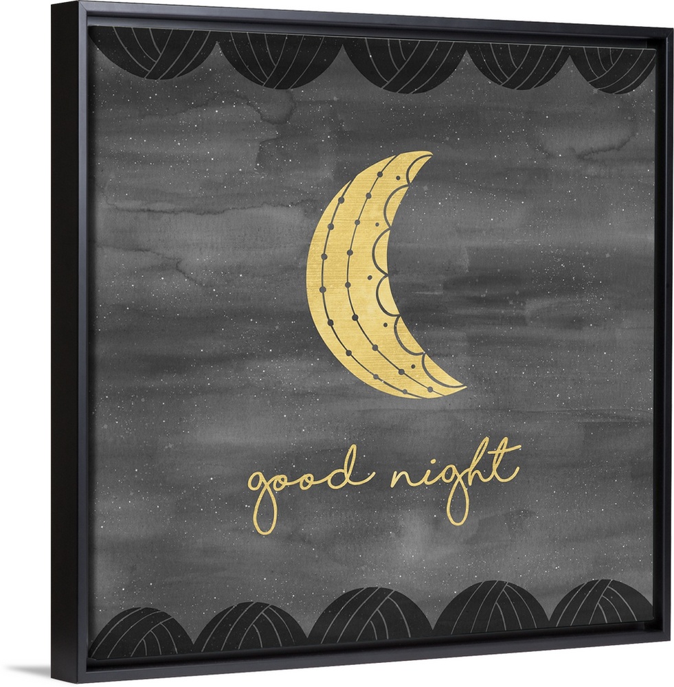<p>"Good Night" and a crescent moon in gold on a gray background with white specks, bordered with black curved shapes.</p>