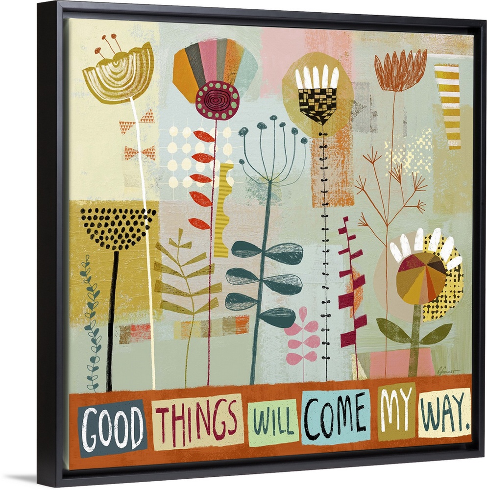 <p>Contemporary painting with a retro feel of colorful shapes and designs making a flowery garden scene.</p>