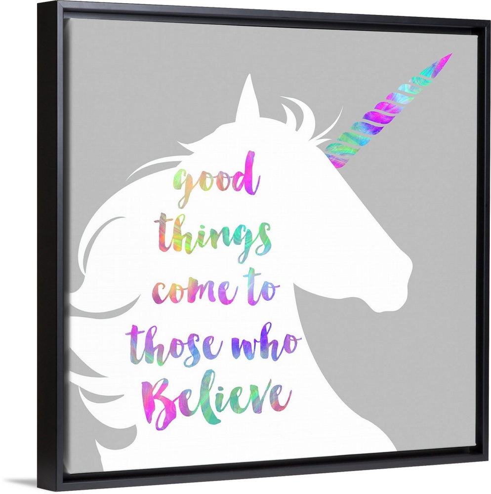 <p>"Good Things Come to Those Who Believe" written in rainbow colors on a white unicorn silhouette.</p>