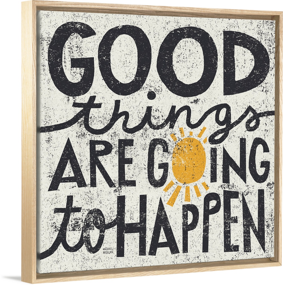 <p>Big, square canvas art of the text "good things are going to happen", the "o" in "going" has been replaced with a sun. All text is in black on a mostly white background with small black specks throughout.</p>
