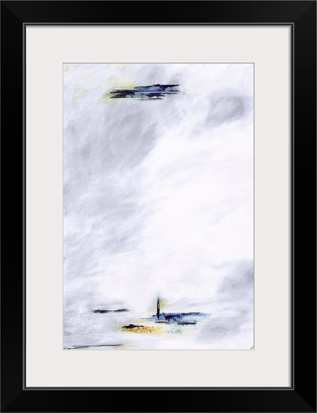 <p>Minimalist abstract painting with a gray and white background and small brushstrokes at the top and at the bottom with blue, orange, yellow, and green hues.</p>