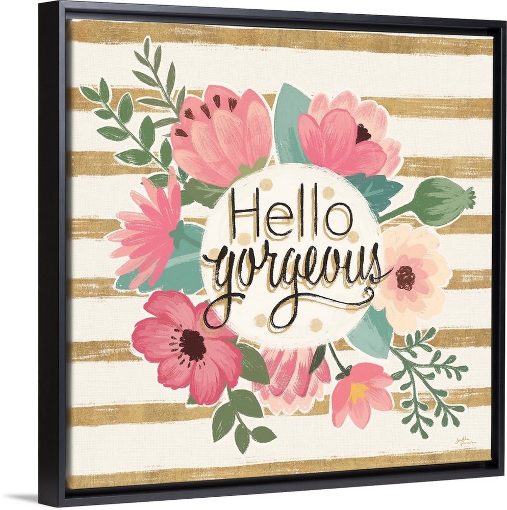 <p>"Hello Gorgeous" surrounded by pink flowers on a gold and cream striped background.</p>