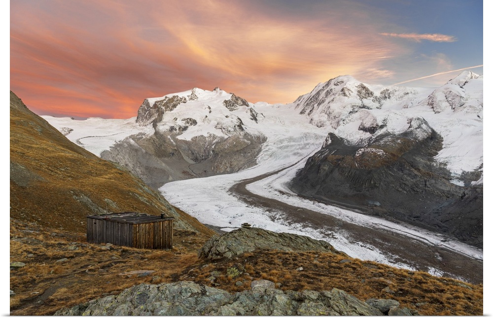 <p>Gorner glacier with the Monte Rosa massif and Lyskamm peaks at dusk, Zermatt, Valais canton, Switzerland</p>