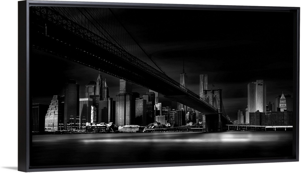 <p>A dramatic black and white photograph of the New York city skyline with the Brooklyn bridge in the center.</p>