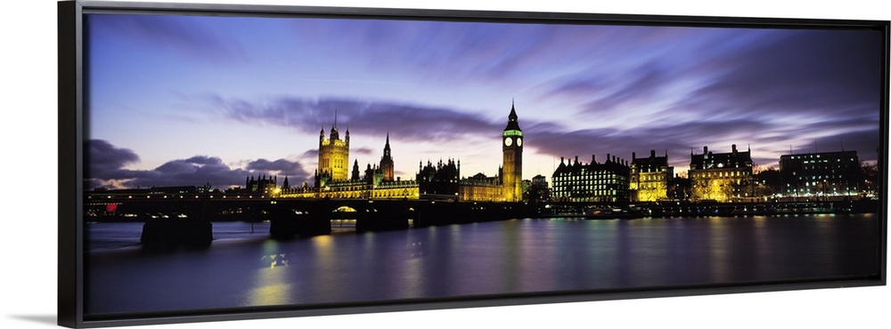 <p>Wide angle, nighttime photograph of the London skyline, including Big Ben and Houses of Parliament, reflecting in the waters of the Thames River.</p>
