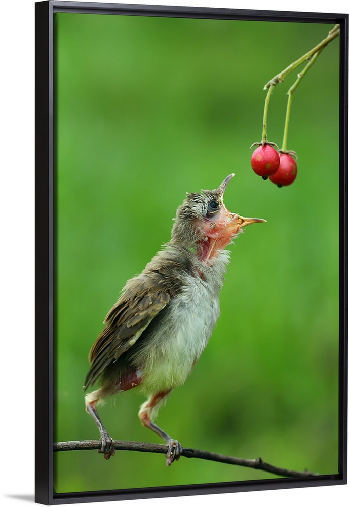 <p>Photograph of a young bird perched on a tree branch grabbing from some food.</p>