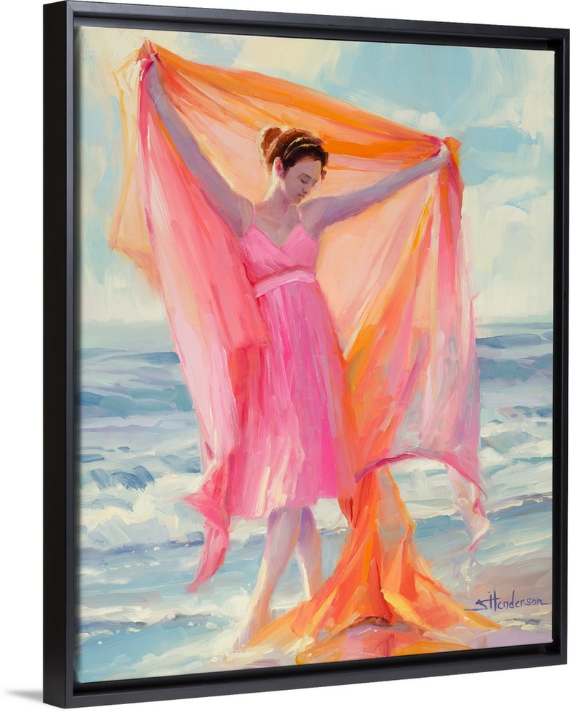 <p>Traditional impressionist painting of a young woman, in a pink dress, dancing barefoot in the ocean surf on a sunny afternoon on the coast</p>