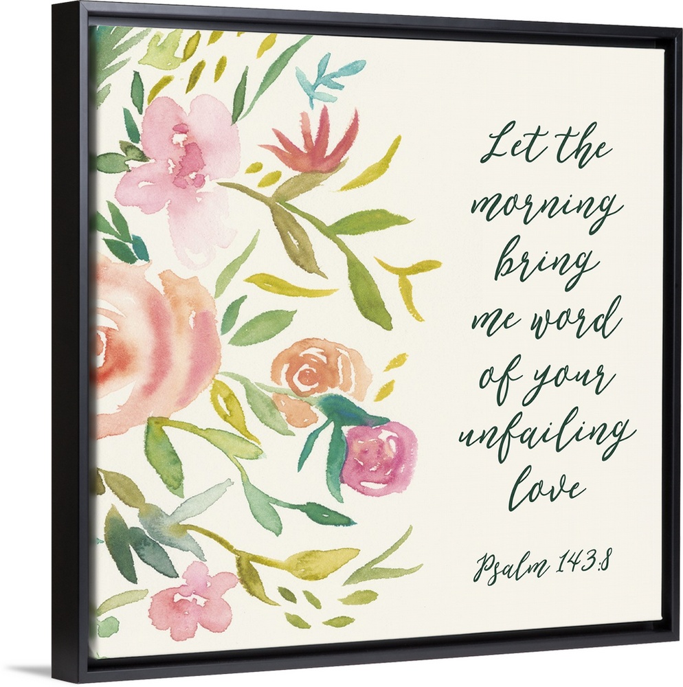 <p>This decorative artwork features the words: Let the morning bring me word of your unfailing love (Psalm 143:8) in green over a light background with charming flowers on the left.</p>