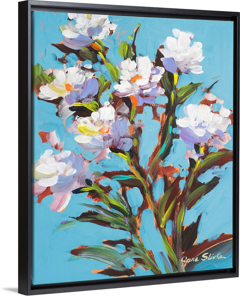 <p>Contemporary painting of several white flowers in bloom.</p>