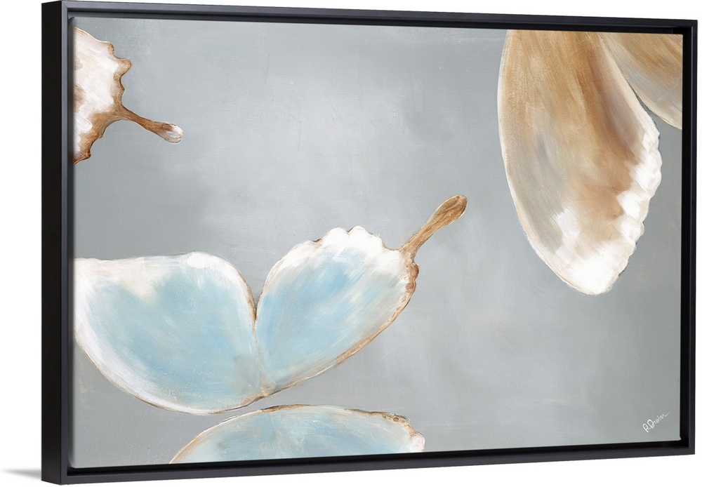 <p>Contemporary abstract painting of pale colored butterflies against a gray background.</p>