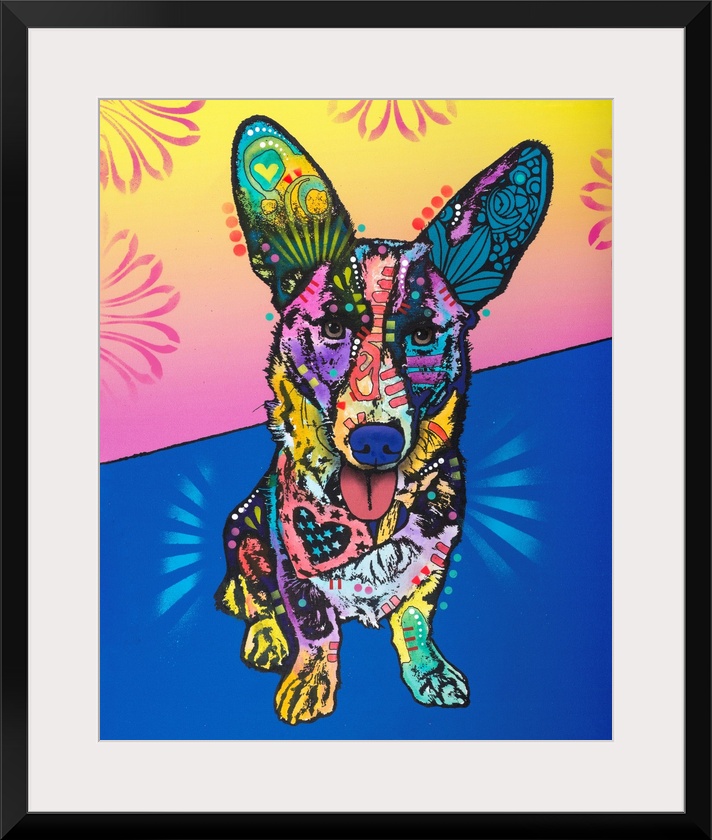 <p>Pop art style painting of a dog wearing a bandanna and colorful abstract designs on a blue, pink, and yellow background with a floral print at the top.</p>