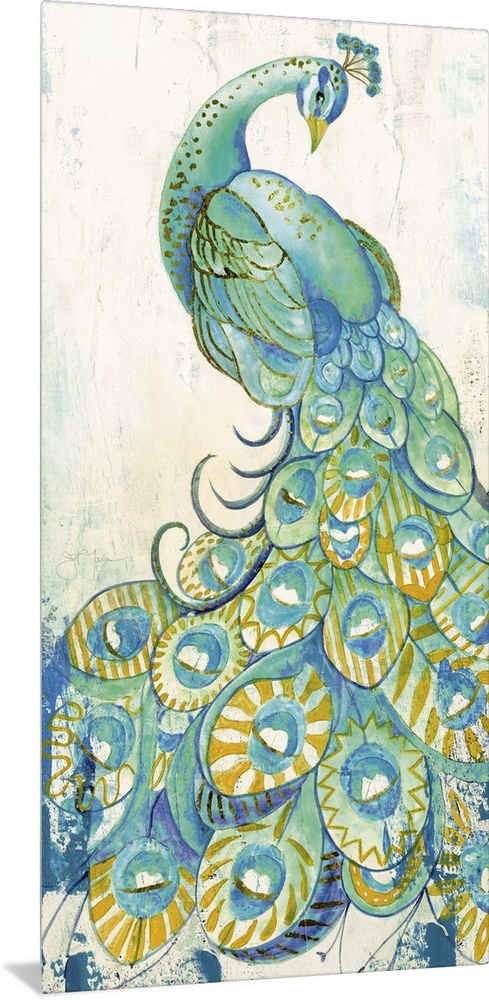 <p>A contemporary painting of a peacock with beautifully decorated tail feathers that spread to the bottom of the canvas.</p>