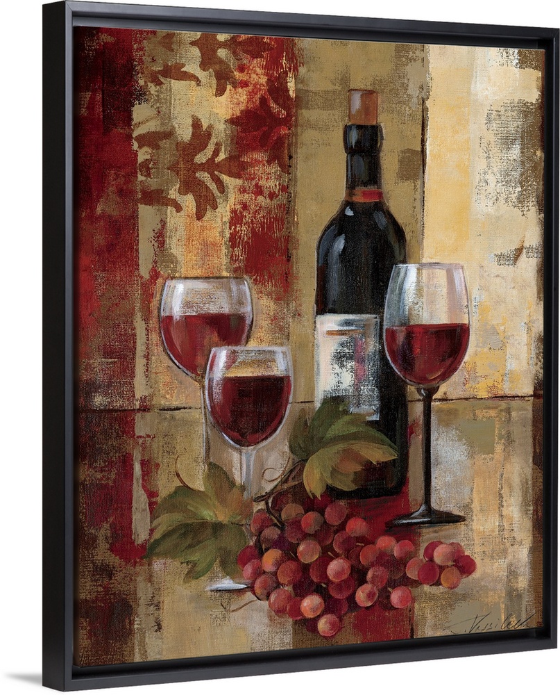<p>Large contemporary art showcases a bottle of fermented grape juice sitting behind a group of three glasses filled with the juice and a single bunch of grapes. Artist creates a backdrop filled with vertical rectangles that incorporates a variety of textures and earth tones.</p>