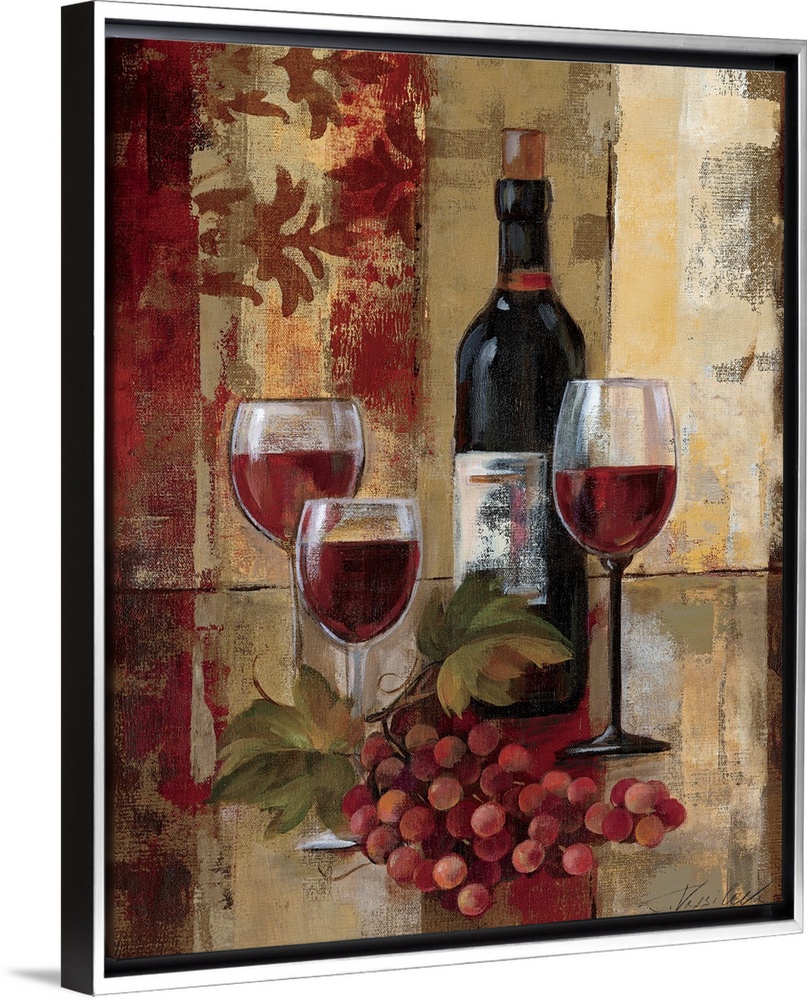 <p>Large contemporary art showcases a bottle of fermented grape juice sitting behind a group of three glasses filled with the juice and a single bunch of grapes. Artist creates a backdrop filled with vertical rectangles that incorporates a variety of textures and earth tones.</p>