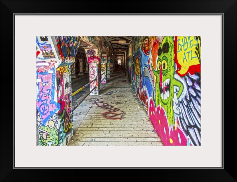 <p>Street art covers the walls, floors, and columns of the Krog Street Tunnel, connecting Inman Park and Cabbagetown, downtown Atlanta, Georgia.</p>