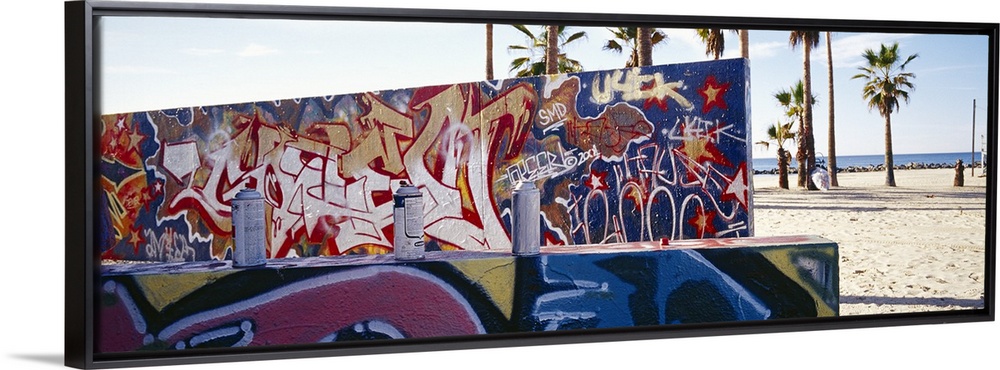 <p>Horizontal, large photograph of two walls covered with graffiti art in Venice Beach, California. The beach and palm trees in the background.</p>