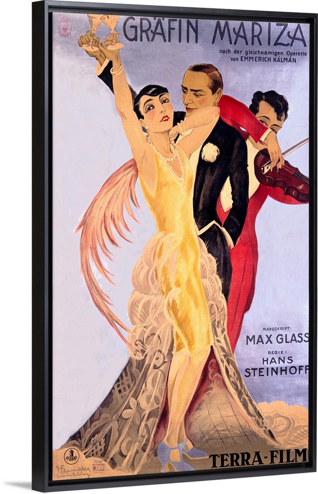<p>Old entertainment advertising print. A man and woman dressed in vintage formal wear are holding up wine glasses with a man playing a violin in the background.</p>