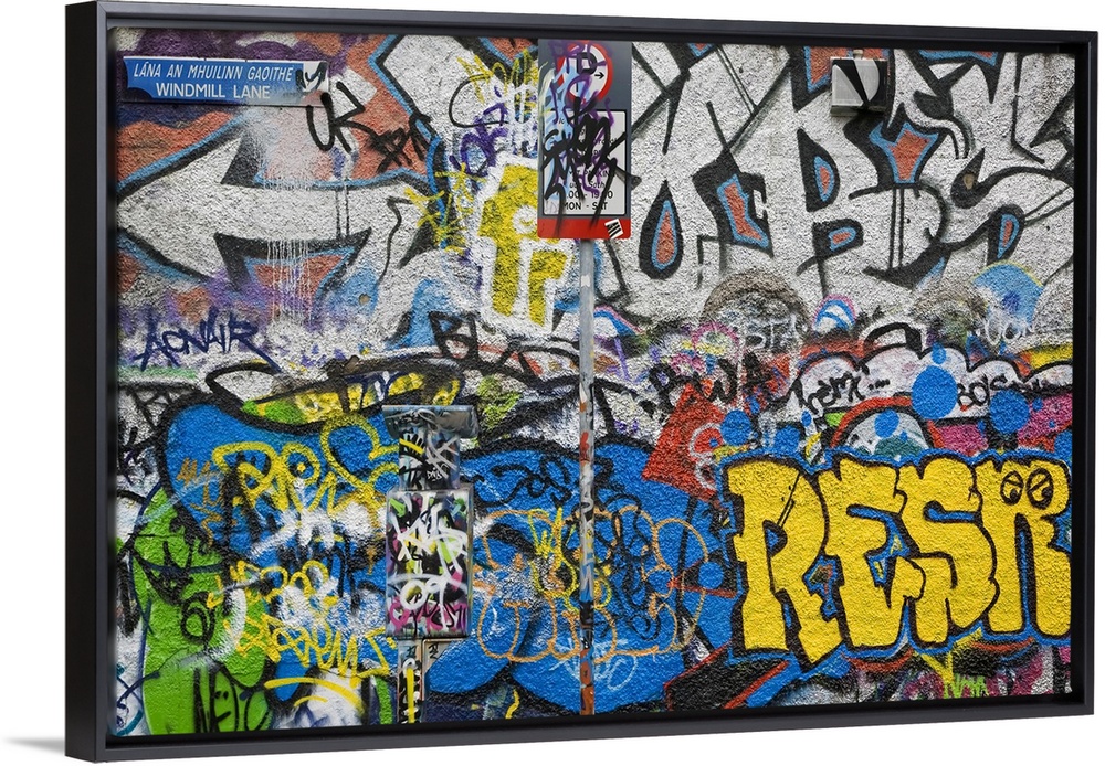 <p>Large photograph of colorful grafitti on the U2 Wall on Windmill Lane in Dublin, Ireland. Crowded mix and clash of cool and bright colors and tones with a rough texture.</p>