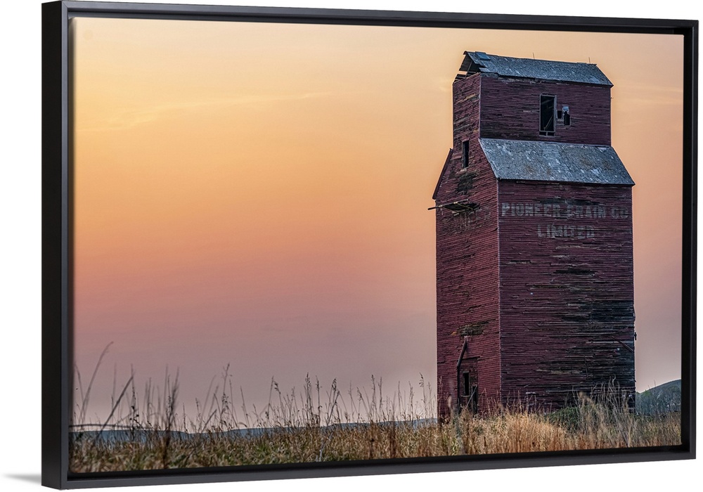 <p>Abandoned and weathered grain elevator at sunset on the Canadian Prairies; Val Marie, Saskatchewan, Canada</p>