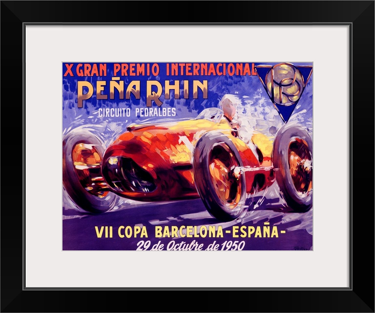 <p>Classic advertisement for the Gran Premio Internacional car race Pena Rhin in Barcelona, Spain on October 9, 1950. A racecar is drawn in motion.</p>