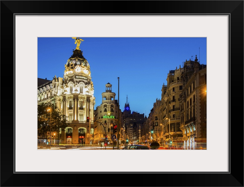 <p>Night view of Gran Via street and Metropolis Building with car light trails, Madrid, Comunidad de Madrid, Spain</p>