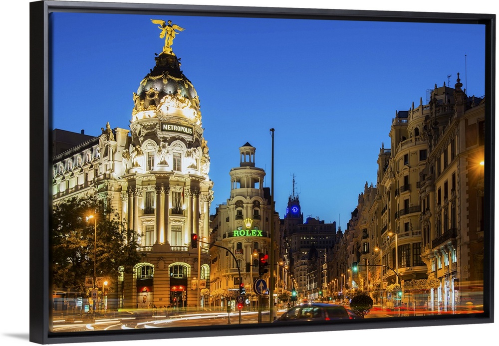 <p>Night view of Gran Via street and Metropolis Building with car light trails, Madrid, Comunidad de Madrid, Spain</p>