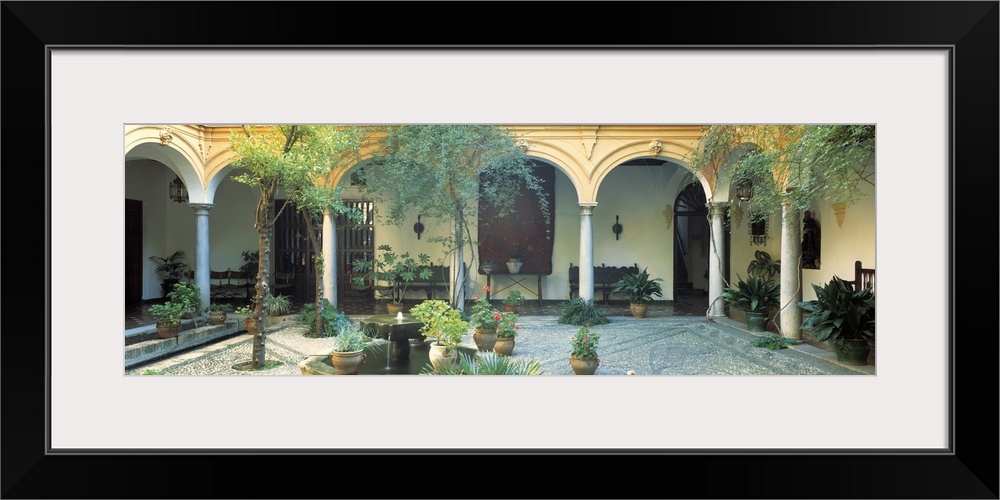 <p>Long photo on canvas of a Spanish courtyard garden with a bunch of potted plants.</p>