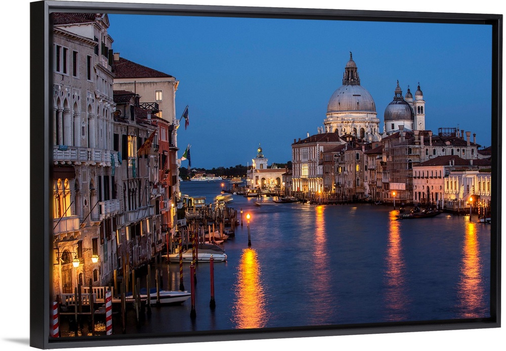 <p>Photograph of Grand Canal lit up at night with the Santa Maria della Salute in the background.</p>