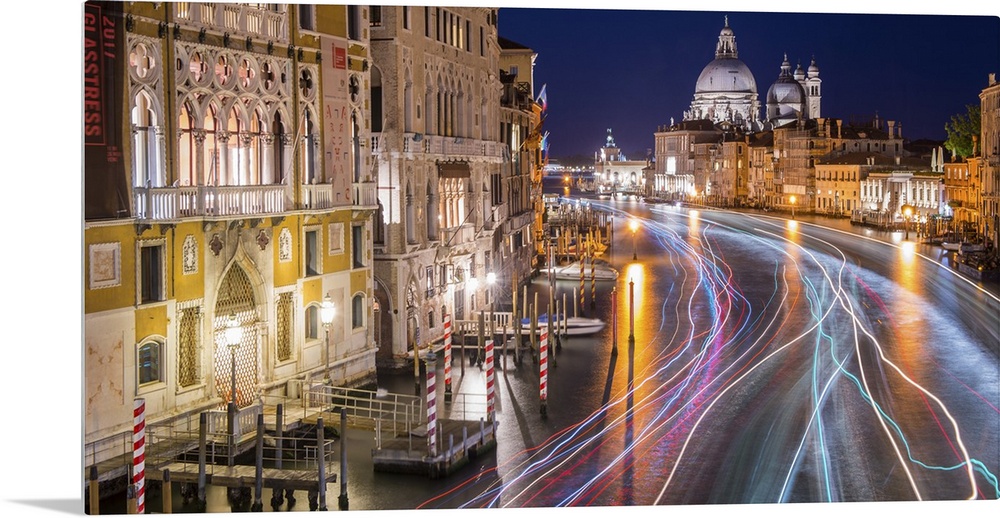 <p>Long exposure photograph of the Grand Canal in Venice lit up at night with light trails from water taxis, boats, and gondolas passing through.</p>