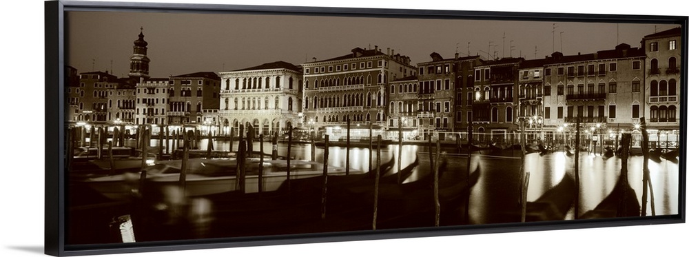 <p>Panoramic photograph of the Grand Canal in Venica, Italy. A line of gondola boats are tied to a dock in the foreground with city buildings in the background at dusk.</p>