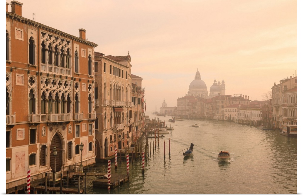 <p>Beautiful Grand Canal, winter fog, morning golden light, Santa Maria della Salute, Venice, UNESCO World Heritage Site, Veneto, Italy, Europe</p>