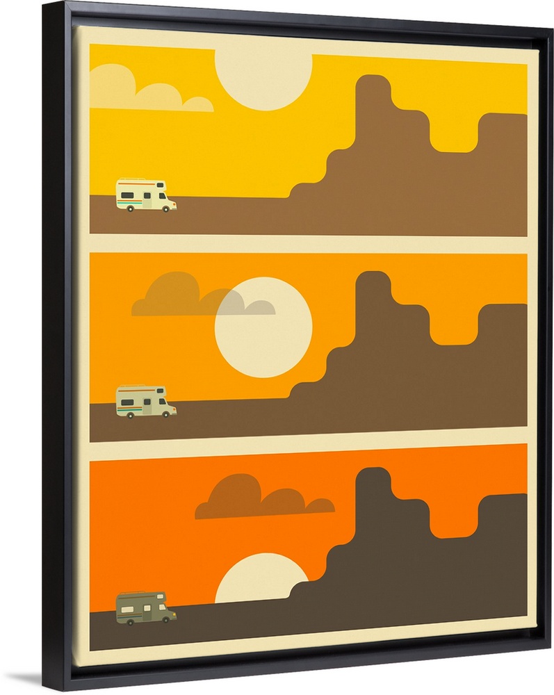 <p>Retro style illustration of a camper parked next to the Grand Canyon, split into three sections showing the stages of sunset.</p>