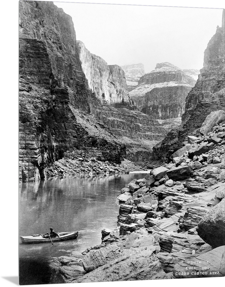 <p>Grand Canyon, C1913. A View Of the Grand Canyon In Arizona, Showing A Man In A Boat On A River In the Foreground, And Snow-Capped Peaks In the Distance. Photographed By the Kolb Brothers, C1913.</p>