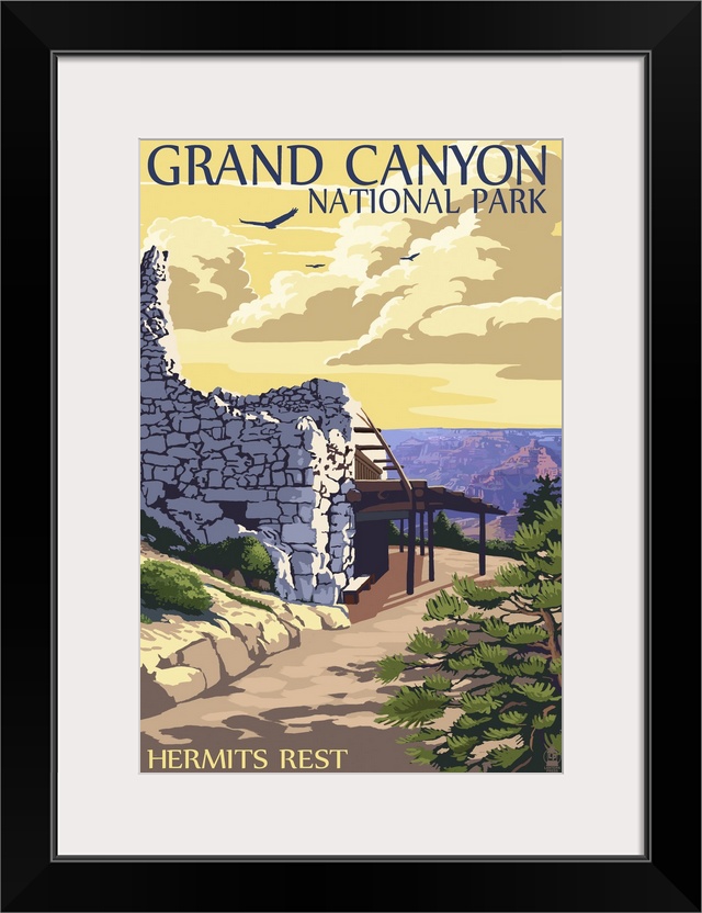 <p>Retro stylized art poster of an old shelter made of stone. Overlooking a massive canyon.</p>